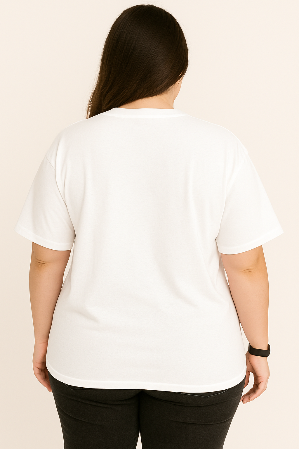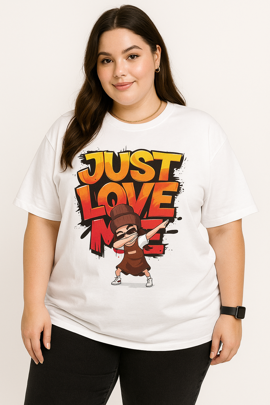 Whether you’re dressing up for a casual day out or chilling with friends, this crisp white oversized tee with its minimalist “Just Love Me” message lets your personality do the talking.