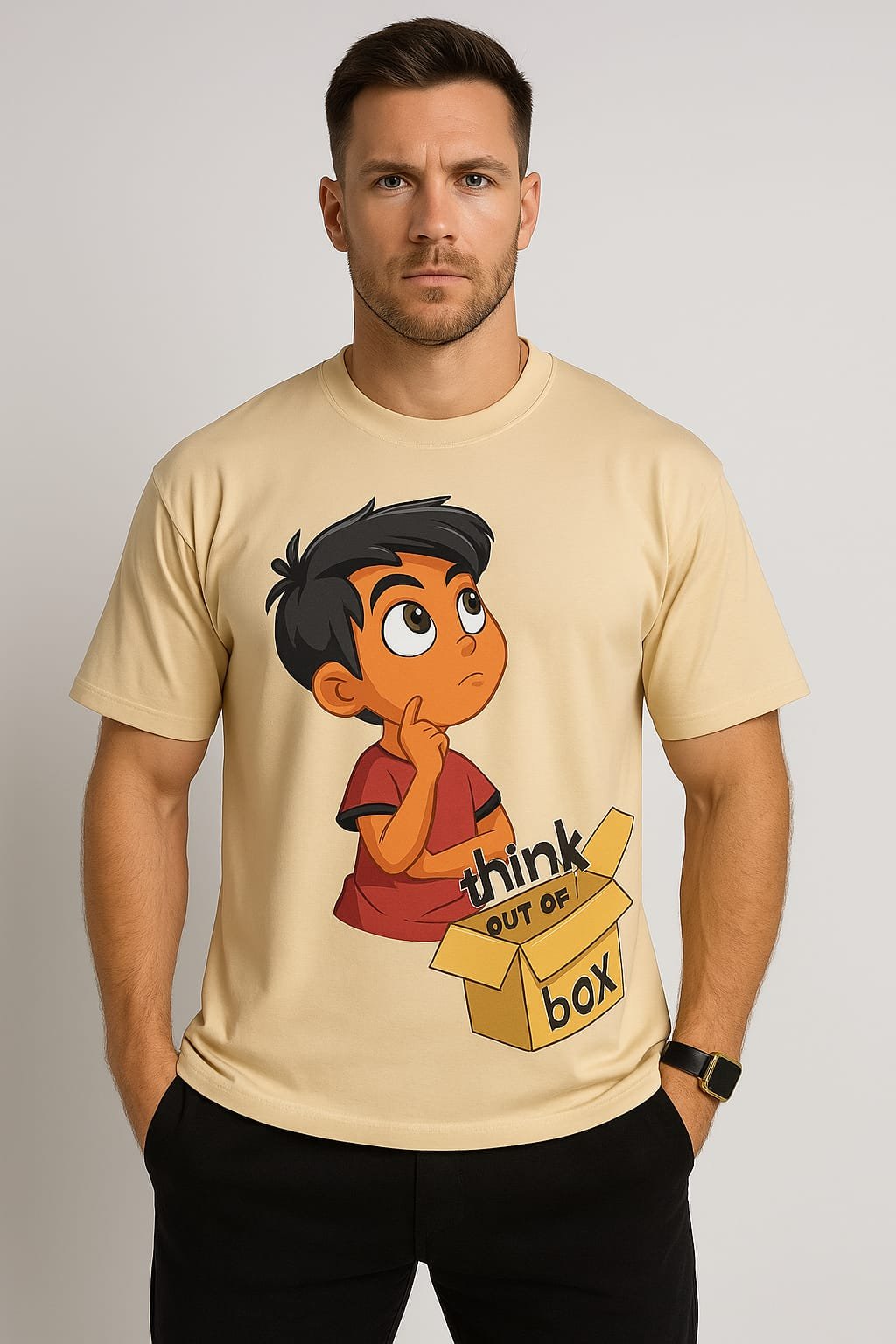 Featuring a minimalist yet powerful “Think Out of the Box” print, this tee is a conversation starter — a wearable reminder to stay curious and creative.