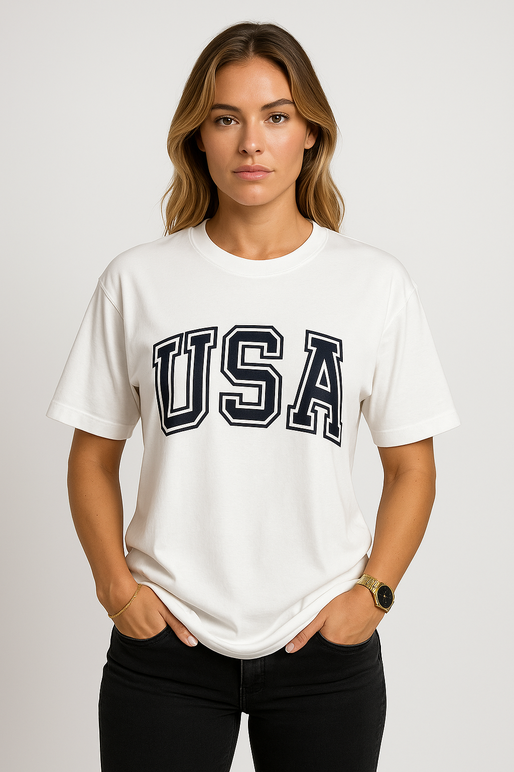 Step into effortless streetwear style with our USA Oversized Unisex T-Shirt, a bold nod to classic American fashion. Designed for both comfort and statement-making appeal, this t-shirt features a clean white base with a striking “USA” varsity-style print on the front.